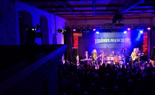 Wir befinden uns ja gerade in der ehemaligen DDR, in der Nähe von Zwickau. Peter Bursch (unterbricht): Ja, wunderschön. Ich freue mich, hier zu spielen. Unglaublich. (Und genau hier kann man sich das von Detlef Bergmann - von den Scheffelbergstudios - aufgezeichnete und ausgezeichnet geschnittene komplette BRÖSELMASCHINE-Konzert anschauen)