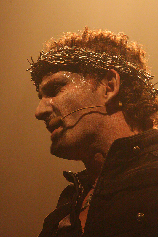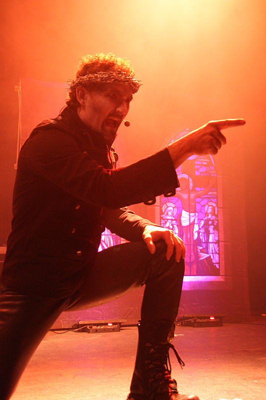 Das optische Hauptaugenmerk liegt aber auf Sänger David Bower, dem man deutlich anmerkt, dass er aus dem Theater kommt. Mit Stacheldraht-Krone auf dem Kopf, blutroten Kontaktlinsen in den Augen und Headset-Mikrofon stürmt er auf die Bühne und beeindruckt nicht nur mit einem außergewöhnlichen Gesang, sondern auch mit seiner lebendigen Performance, bei der er auch immer wieder mit dem Publikum interagiert. Es ist wirklich ein Hochgenuss, wie er mit Gesten und Mimik die Songs interpretiert. Zu "Plague And Fyre" kommt er mit Mönchskutte und schauriger Vogelskelett-Maske auf die Bühne, bei "Blasphemy And The Master" geißelt er seinen nackten Oberkörper mit einer Peitsche. Oder er springt in den Fotograben und legt den Zuschauern in der ersten Reihe die Hände auf, um eine Dämonenaustreibung vorzunehmen. Natürlich merkt man zu jeder Sekunde, dass das nichts anderes als großes, shakespearianisches Theater sein soll, das jedoch ist auch ganz großartige Unterhaltung. In den 45 Minuten, die HELL zur Verfügung stehen, kommen natürlich nur Songs des einzigen Album "Human Remains" zum Zug, die werden von der Band bei gutem Sound (bei dem es nur anfangs leichte Schwierigkeiten gibt) souverän gespielt. Zu einem perfekten Auftritt fehlen nur noch die Höllenfeuer-Pyros, aber die gibt es für eine Vorband natürlich nicht.