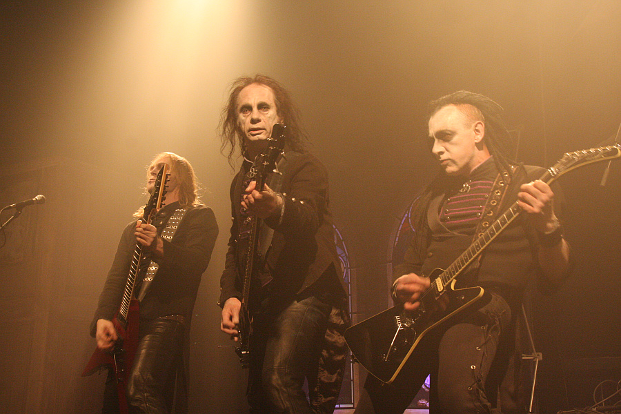 Kurz vor 19.30 Uhr erklingt RAINBOWs "Long Live Rock 'n' Roll" in der Halle und gibt den Startschuss, wenige Augenblicke später erscheinen HELL auf der Bühne. Und zünden von der ersten Sekunde an ein Feuerwerk theatralischen Heavy Metals. Links und rechts auf der Bühne stehen Aufsteller mit beleuchteten Kirchenfenstern, die aber überaus unfromme Darstellungen zeigen. Eine gigantische Kanzel steht ganz links und wird im Verlaufe der Show auch zum Einsatz kommen. Die Mitglieder der Band, die ihre Anfänge zu Beginn der 80er hatte, sind fahl geschminkt und wirken, als kämen sie direkt aus Madame Tussauds Wachsfigurenkabinett, sind dafür aber enorm beweglich. Relativ unscheinbar auf der linken Bühnenseite bearbeitet Initiator Andy Sneap sein Instrument, optisch machen die beiden anderen Saiteninstrumentalisten einiges mehr her. Basser Tony Speakman sieht man am deutlichsten an, dass er nicht mehr der Jüngste ist, sein tief gefurchtes Gesicht sorgt in Kombination mit dem schütteren Haar für ein skurril-gespenstisches Gesamtbild. Mit seinen langen Dreads könnte Gitarrist Kev Bower dagegen auch bei den NINE INCH NAILS oder bei MARILYN MANSON mit auf der Bühne stehen, ohne negativ aufzufallen.