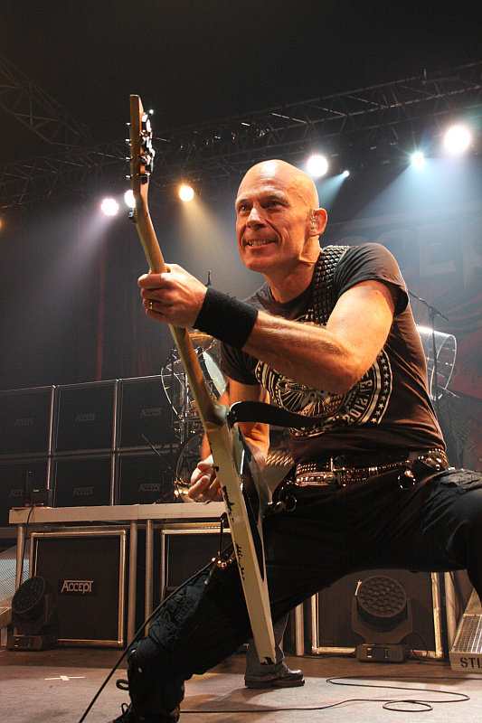 Eine halbe Stunde dauert die Umbaupause, dann stehen ACCEPT auf der Bühne. Und werden in den kommenden zwei Stunden beweisen, dass sie gefahrlos eine starke Vorband wie HELL mit auf Tour nehmen können, wohl wissend, dass man da noch locker einen draufsetzen kann. Im Hintergrund prangt ein großes Backdrop mit dem bunten Cover der "Stalingrad"-Platte (das ja nur eine Notlösung darstellt), davor erhöht das transparente Drumkit von Stefan Schwarzmann mit fettem Gong im Hintergrund und zwei riesigen Toms links und rechts. Vor den Drums ist eine kleine Fläche, auf die die Musiker über zwei Stege links und rechts kommen. Und wie es sich gehört, zieren insgesamt 27 Boxen mit ACCEPT-Logo das Bühnenbild. Das sieht laut aus und laut sind ACCEPT auch an diesem Abend. Viel zu laut ist zunächst der Drumsound und es dauert einige Zeit, bis man das in den Griff bekommt. Ab dann ist der Sound auch ausgewogen, aber in der Tat so laut, dass Ohrenstöpsel an diesem Abend dringend angebracht sind.