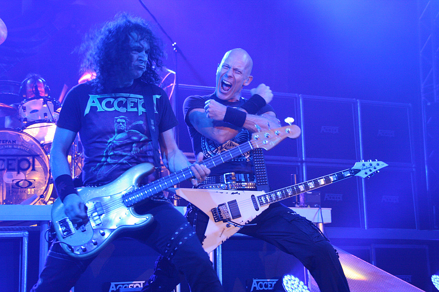 Nach dem "Heaven And Hell"-Intro geht es - etwas überraschend - nicht mit "Hung, Drawn And Quartered", dem Opener des aktuellen Albums los, sondern mit "Hellfire", bei dem die Bühne passend in rotes Licht getaucht ist. Und sofort wird klar, was einen in den nächsten zwei Stunden erwartet. Ein Wolf Hoffmann an der Gitarre, der entweder wie ein Honigkuchenpferd grinst, Grimassen schneidet oder die typischen Posen mit Basser Peter Baltes zur Schau stellt. Die beiden sind die Aktivposten auf der Bühne. Der zweite Gitarrist Herman Frank erledigt seine Aufgabe etwas zurückhaltender, aber ebenfalls mit viel Spielfreude. Alle drei sind für charakteristischen Backing Vocals zuständig, die direkt im folgenden "Stalingrad" zum Zuge kommen. Sänger Mark Tornillo schwenkt in dem Song auch eine ACCEPT-Flagge, was ein bisschen übertrieben pathetisch wirkt, aber sei es drum. Das gehört bei ACCEPT eben auch dazu. Mit "Restless And Wild" folgt der erste Klassiker von 1982, vom gleichen Album folgen noch "Neon Nights", natürlich "Princess Of The Dawn" (mit gutem Bass-Solo) sowie als letzter Song des Hauptteils das famose "Fast As A Shark". Überhaupt ist die 21 Songs starke Setlist extrem 80er-lastig. Von "Breaker" (1981) gibt es den Titeltrack und "Son Of A Bitch", von "Balls To The Wall" (1983) natürlich den Titeltrack als allerletzten Song sowie "Losers And Winners" und von "Metal Heart" (1985) drei Songs: "Up To The Limit", "Living For Tonite" sowie den Titeltrack als erste Zugabe. Dazu wird der Löwenkopf, der früher das Logo zierte, hinter den Drums in die Höhe gehievt und leuchtet rot aus den Augen. Mit "Monsterman" und "Aiming High" vom "Russian Roulette"-Album von 1986 gibt es weitere Songs, die man nicht unbedingt auf der Rechnung hatte, zu hören. Ein einziger Song aus den 90ern wird gespielt, nämlich "Bulletproof" von der "Objection Overruled", bei dem sich Baltes und Hoffmann ein cooles Duell Bass Vs. Gitarre liefern. Auch bei solchen Aktionen spielen ACCEPT ihre Erfahrung voll aus, es wird nie übertrieben in die Länge gezogen (gleiches gilt für die Mitsingspielchen bei den üblichen Verdächtigen), darf aber auch nicht fehlen. Seinen großen Einzelmoment hat Hoffmann nach "Shadow Soldiers" vom neuen Album, das jetzt schon als Liveklassiker gesehen werden darf. Fehlen nur noch die Songs vom Comebackalbum "Blood Of The Nations", davon werden - auch etwas überraschend - "Pandemic", "No Shelter", "Bucketful Of Hate" und natürlich "Teutonic Terror" als zweite Zugabe gespielt.