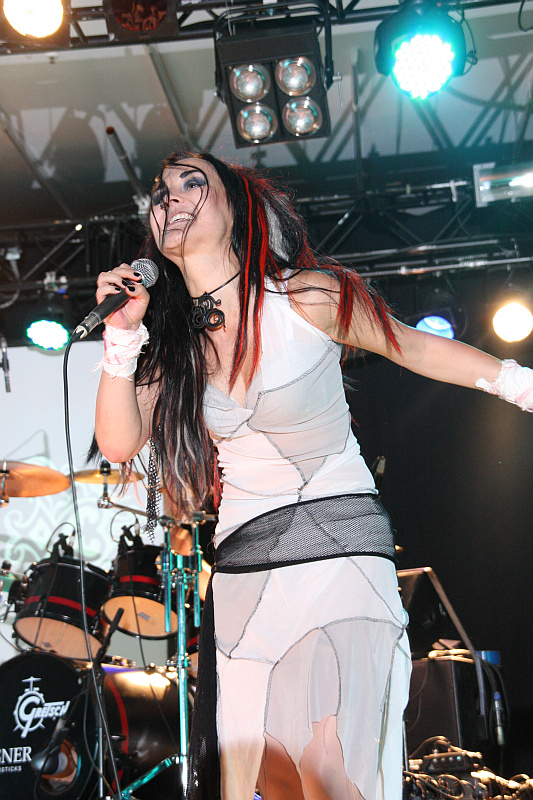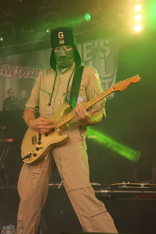 Amphi Festival 2011Den Anfang macht mit SHE'S ALL THAT eine Band, die 2010 ihr Debütalbum veröffentlicht hat, die aber vor allem durch ihre höchst ungewöhnliche Bühnenshow im Gedächtnis bleibt. Denn die Bandmitglieder verstecken sich hinter hautengen Masken, was dem Ganzen eine verstörende Atmosphäre gibt. So springt die Figur am Mikrofon zwar wild in der Gegend herum, sieht aber aus, wie ein uralter Kobold. Der Mund bewegt sich zum Gesang, doch ansonsten ist die Mimik unverändert - klar, ist ja nur eine Maske. Ebenso skuril wirkt der Schlagzeuger, während der Gitarrist sich unter Mütze und Gesichtsmaske versteckt. Musikalisch gibt es einen Mix aus Alternative Rock, Pop und Industrial, dazu ist der Gesang oft mal verzerrt. Mit der Zeit bemerkt man dann auch, dass die Figur, die das Publikum pausenlos antreibt, eine Frau ist. Da es immer noch nieselt, suchen viele Leute Schutz unter den Pilzen, was der Band sicherlich zugute kommt. Insgesamt eine spannende Angelegenheit, die auf jeden Fall viel besser gefällt, als das, was Sängerin Shirin in den 90ern gemacht hat - da war sie nämlich mit der Band NOBLE SAVAGES im Dance-Pop unterwegs.