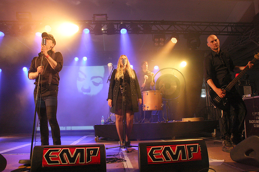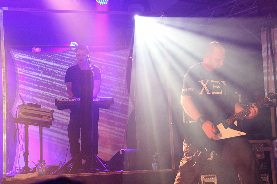 Amphi Festival 2011Klassischer wird es danach mit CLAN OF XYMOX. Die niederländische Dark-Wave-Legende aus den 80ern hat ihren Sound im Laufe der Jahre zwar mit Postpunk, Gothic Rock und vermehrt auch mit mehr Synthie-Elektronik ausgeweitet, auf der Bühne sehen Bandleader Ronny Moorings und der Bass und Gitarre bedienende Aktivposten Mario Usai aber immer noch schön nach den 80ern aus, während Tastenfrau Yvonne de Ray eher rüschig aussieht. Musikalisch gibt es eine Mischung aus alten Klassikern wie "Louise", "Jasmine And Rose", "Stranger", "There's No Tomorrow" und "Farewell" und starken neueren Nummern à la "In Love We Trust", "Hail Mary" und "Emily". Insgesamt eine nette, runde Sache, die zwar nicht gerade für überbordende Begeisterung sorgt, aber irgendwie hübsch ist.