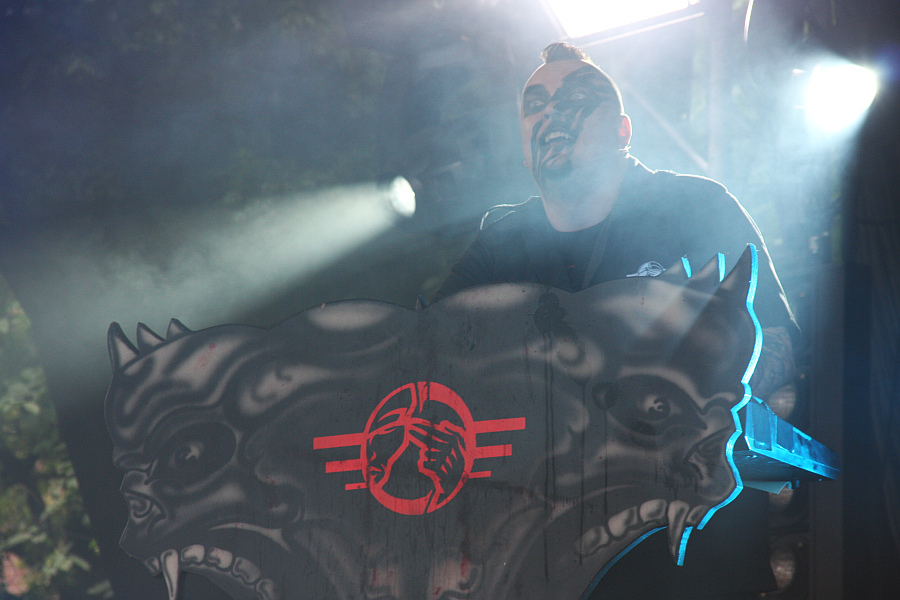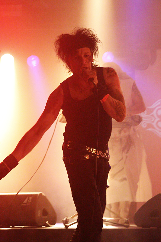 Amphi Festival 2011Die Überraschung ist groß, als Bruno Kramm, der diabolische Clown und musikalische Kopf von DAS ICH die Bühne betritt und verkündet, dass Frontmann Stefan Ackermann noch immer wegen schwerer Krankheit unabkömmlich sei und man die Show deshalb mit besonderen Gästen absolvieren würde. Das war wohl auch schon beim Wave Gotik Treffen an Pfingsten der Fall, was dem Verfasser dieser Zeilen ebensowenig bekannt war, wie einem Großteil des Publikums, das dementspreched Schwierigkeiten hat, stimmungstechnisch auf Temperatur zu kommen. Klar ist auch, dass ein extrem charismatischer Sänger wie Stefan Ackermann nun mal einer ist, eigentlich nicht zu ersetzen ist, trotzdem hat der Auftritt ein besonderes Flair. Als ersten Gast begrüßt Bruno die lettische Sängerin Vic Anselmo, die den DAS ICH-Song "Das dunkle Land" auf ihrem kommenden Album covert. Die Dame besticht vor allem durch ihre charakterstarke Ausstrahlung und hat außerdem eine gute Stimme. Im Laufe der Show kommt sie deshalb auch noch für "Meine Wiege", "Reanimat" und das große Finale auf die Bühne. Zweiter Gastsänger ist Myk Jung von THE FAIR SEX, der sich zwar redlich bemüht, aber einen durchwachsenen Eindruck hinterlässt. Zu oft blickt er auf seine Textblätter, was man ihm zwar nicht vorwerfen sollte, doch wirkt er aufgrund der Tatsache, dass er die Texte nicht komplett auswendig kennt, recht unsicher. Da Bruno aber mitsingt, funktionieren "Kain und Abel", "Kannibale", "Kindgott" und "Gottes Tod" noch ganz gut. Dritter Gast ist Sven Friedrich (DREADFUL SHADOWS, ZERAPHINE, SOLAR FAKE), der erst "Schwarzes Gift" singt und auch bei der Zugabe dabei ist. Die lautet natürlich "Destillat" und als alle drei Gastsänger mit auf der Bühne sind und man auch noch Ansagen für Stefan macht, ist das Finale dann doch noch ein kleiner Gänsehautmoment. An dieser Stelle gute und schnelle Genesung an Stefan Ackermann.