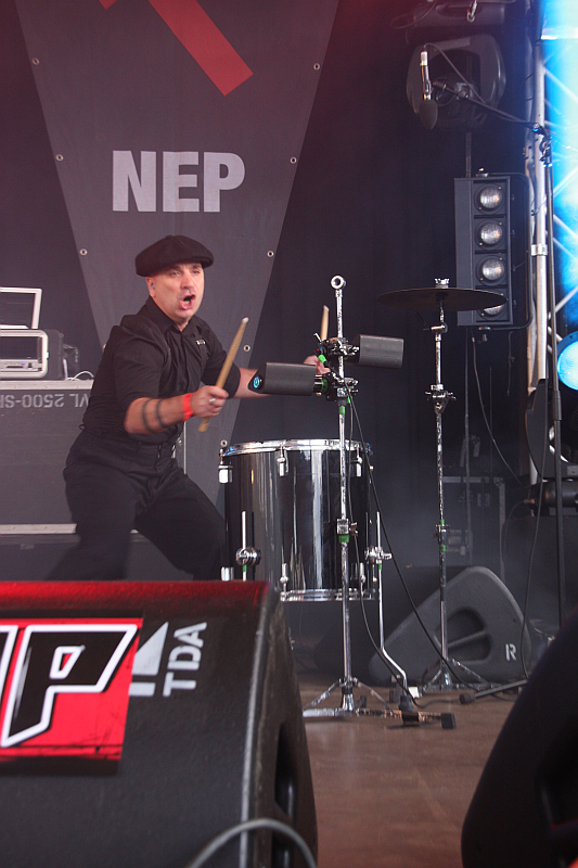 Amphi Festival 2011SALTATIO MORTIS auf der Mainstage werden nur im Vorbeigehen kurz belauscht, denn es gilt, zeitig wieder im Staatenhaus zu sein. Dort steht mit FEINDFLUG die Band auf dem Programm, die bei der letzten Show auf dem Amphi mit ihren Bässen dafür sorgte, dass der Putz im Staatenhaus von den Wänden fiel, woraufhin die Location aus Sicherheitsgründen geschlossen wurde. In diesem Jahr bleibt zum Glück alles intakt, als das Kollektiv sein Inferno aus Stroboskop-Blitzen, brachialen Rhythmen und Percussions und wilder Thrash-Gitarre entfacht. Zwar hört sich jeder der zehn gespielten Songs (darunter "AK 47", "Truppenschau", "Roter Schnee" und "Stukas im Visier") irgendwie gleich an, aufgrund der hypnotischen Wirkung der Kombination aus Licht und Sound ist der Auftritt trotzdem beeindruckend. Das militaristische Auftreten muss man zwar nicht zwingend gut finden, doch passt es ins perfekt Konzept, das an diesem Nachmittag die Massen anzieht. Das Staatenhaus ist bis auf die allerletzte Ecke gefüllt und sinnvollerweise wird niemand mehr ins Gebäude gelassen. So warten einige hundert Zuschauer vergeblich vor geschlossenen Toren auf Einlass.