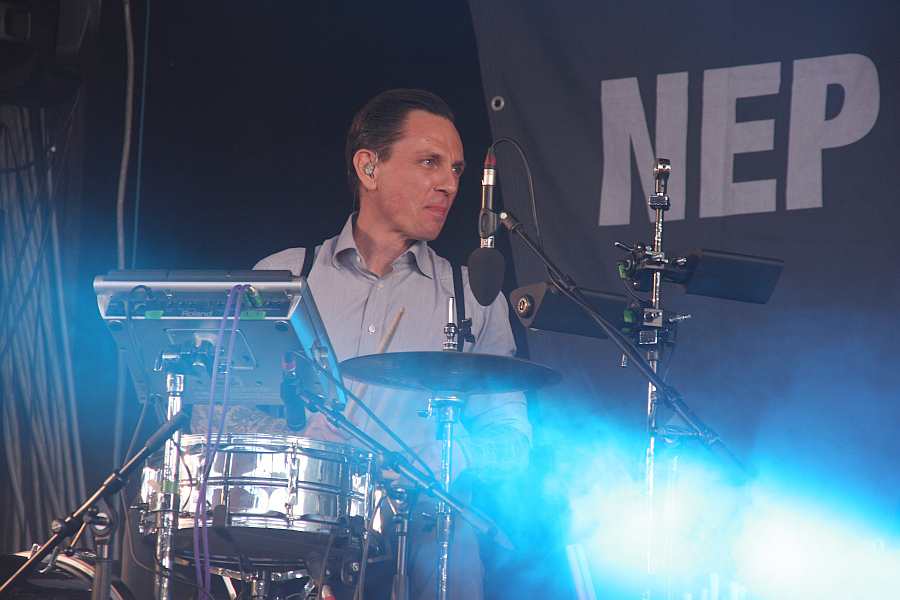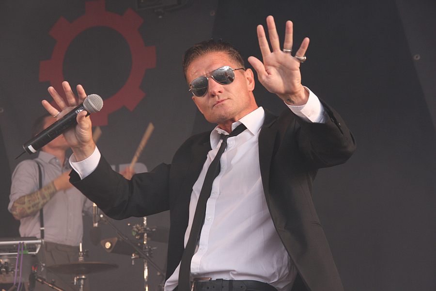 Amphi Festival 2011Dem Comebackalbum "Industrial Complex" folgt nun der NITZER EBB-Auftritt auf dem Amphi Festival. Jason Payne und Bon Harris sorgen für den EBM-Unterbau, zu dem Sänger Douglas McCarthy im schnieken Anzug und mit Pilotensonnenbrille über die Bühne tänzelt. Das wirkt manchmal ein bisschen zu aufgesetzt und gekünstelt und will nicht unbedingt zum klassischen Sound passen. Mit dem eröffnenden "Getting Closer" und dem an fünfter Stelle platzierten "Let Your Body Learn" kommen zwei der größten Hits schon recht früh zum Zuge und heizen die Stimmung schnell an. Der Rezensent begibt sich inzwischen jedoch zum Beachclub, um die schweren Beine ein bisschen hoch zu legen und freut sich, dass im Laufe des Sets auch das ruhige "Undone" vom aktuellen Album zum Zuge kommt. Zurück in Bühnennähe sieht man bei der Zugabe Jürgen Engler von DIE KRUPPS auf der Bühne und zusammen intoniert man "Machineries Of Joy", die englische Version von "Wahre Arbeit, wahrer Lohn".