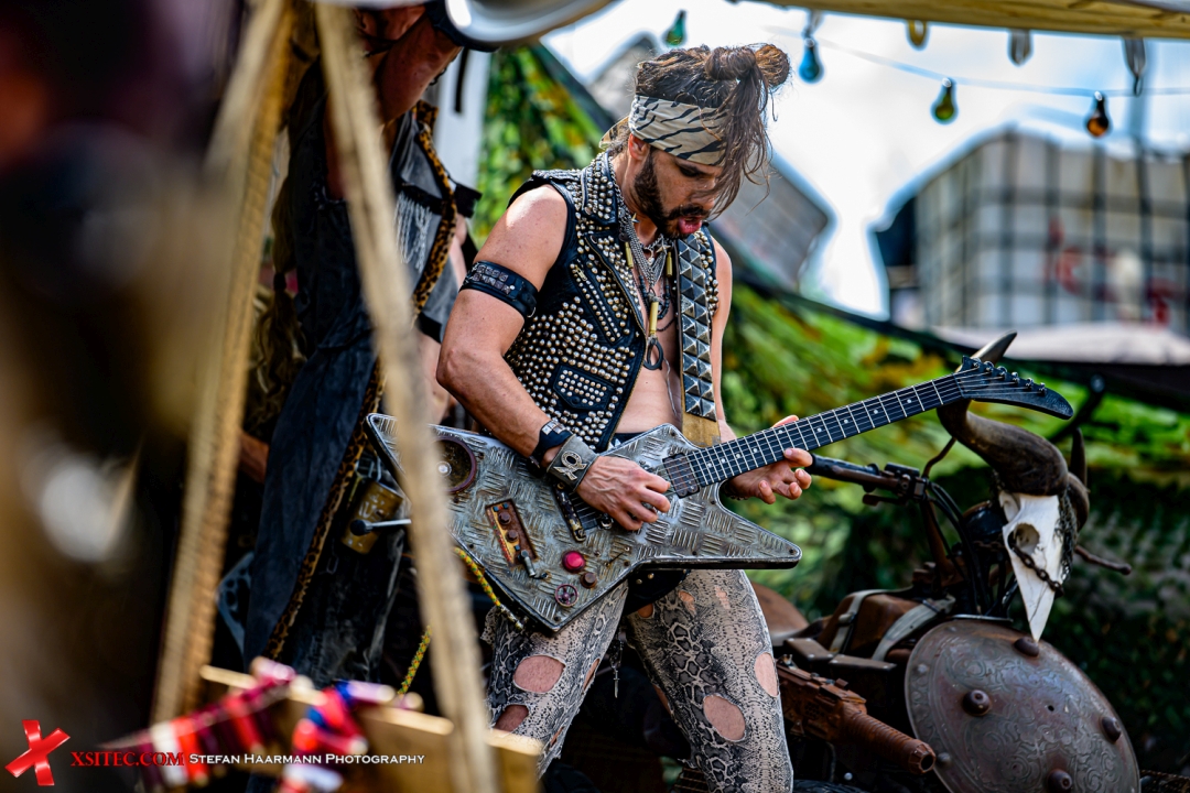 Am Nachmittag geht es weiter mit dem nächsten musikalischen Highlight: MEGABOSCH auf der Wasteland Stage. Die Band ist bekannt für ihre energiegeladene Mischung aus Industrial Rock, Metal und einer Prise postapokalyptischer Show. Zwischen Schrottplatz-Ästhetik, brummenden Motorengeräuschen und wuchtigen Gitarrenriffs brodelt die Stimmung. Das Publikum feiert dicht gedrängt vor der Bühne, während die Sonne vom Himmel knallt.